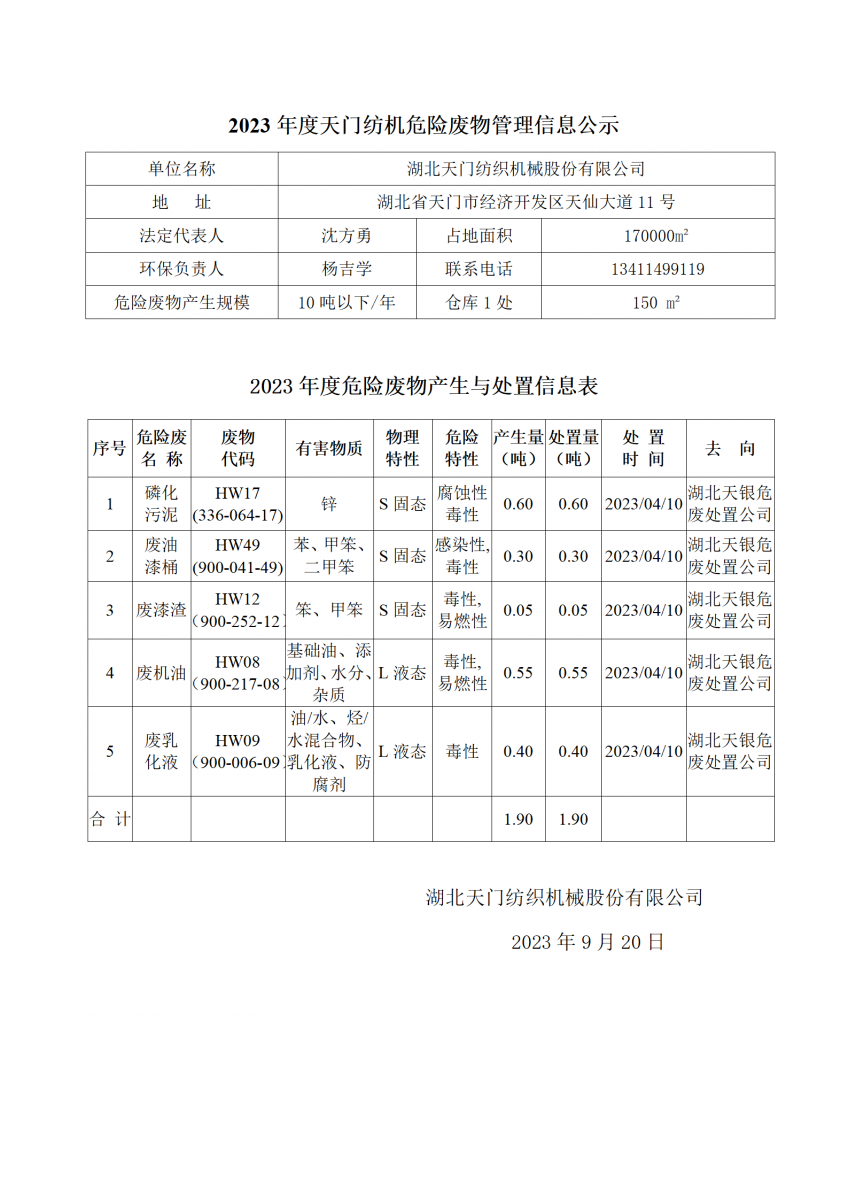 2023年度天門紡機(jī)危險(xiǎn)廢物管理信息公示